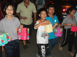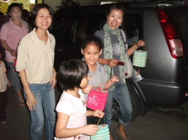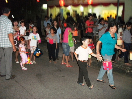 提灯笼游行环节,是当晚的另一高潮,大家顺着次序到佛殿外, 领取义工已准备好的纸灯笼,一家大小手牵手到佛堂门外列队, 由真信师父带领大众欢欢喜喜地提灯笼游行去了。 “月亮圆, 月亮圆, 月亮照在我的家,没有春夏秋冬的家,流传千年……”小孩哼得很轻快,爸爸跟着一起唱,妈妈婆婆不好意思唱,只有嘻嘻哈哈,提灯笼游行就在歌声与欢笑声中圆圆满满的结束。