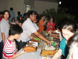 最后是享用茶点及猜灯谜,当晚食物皆由檀香净苑各单位的家庭成员报效,有叻沙、咖喱面、荷叶饭、炒饭、炒面、炒米粉、各类糕点及月饼。大众吃得不亦乐乎。享用茶点的当儿,大家也开始一边游走在灯谜中,找出灯谜的答案。