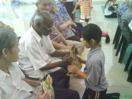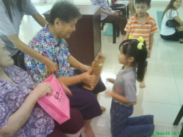 最后,小菩萨们最期待的庆生会时段终于到来了!这一次是为九月份至十二月份过生日的晚晴苑老菩萨及爱心家族成员庆生。大家带着感恩喜悦的心唱颂《含泪的感恩》,从中深深地体会到生日之所以称为母难日的原因,更升起了一股对母亲的敬佩与感恩。唱过了佛化生日歌,寿星们许愿后,便是切蛋糕仪式。过后,寿星门便逐一从师父手中接过生日礼物,然后欢欢喜喜地向妈妈献花。