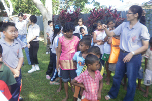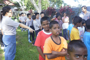 过后,大家去参观孤儿院里的公园。那里种植了各式各样的花草树木,还建了一个喷水池,池里还养了许多肥美的鲤鱼。此外,公园里还建了一座凉亭并放置一架秋千,让孤儿们闲暇时可乘凉及玩乐。我们还在公园里看到3只孔雀。我们希望看到孔雀开屏,不过孔雀看到我们这么多人涌向它们,都吓得躲到矮树下了。
