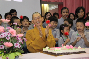 大家齐唱《佛宝歌》,为节目揭开序幕。接着是筹委会主席邱甲煌爱心爸爸致歡迎詞,之后恭请尊敬的真如法师慈悲开示。接下来,司仪带领大家唱《佛化生日歌》为6月至12月生日的菩萨们庆祝生日,由真如法师带领小菩萨切蛋糕。庆生会虽然简单,但看每位寿星菩萨手拿着美丽的花,笑盈盈的一起与师父大合照是多么温馨。