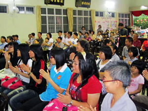 享用晚餐之后,来到了简单而隆重的颁奖仪式。真信师父颁发职员服务奖予在檀香幼儿园服务五年以上的吴宝琴老师以感恩她对檀香幼儿园的不离不弃;陈丝丝师姐和谭富天师兄也从师父手中领取2011年八关斋戒会100%出席率证书,师父希望借此鼓励更多人从不缺席的参加八关斋戒会。