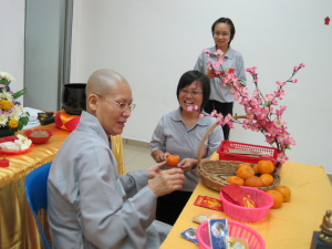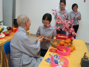 接着,维那带领大众感恩上真下信法师的慈悲开示。早课在三皈依及回向声中圆满结束。紧接下来是大众向法师拜年的环节。大众都给予筹委们很好的配合,有秩序地向法师拜年。