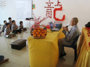 止静约5分钟后, 紧接下来是大众期待的佛法开示。尊敬的上真下信法师以 “新年种善因,未来得善果” 来解说 “新年快乐” 之意义。法师劝诫说我们不能只靠祈求或祝福就希望可以得到快乐;而是在这新的一年里多制造快乐的 “因” ,才能享受到快乐的 “果” 。