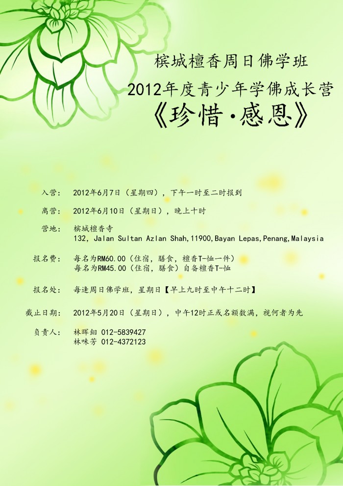 Submitted by miyun on Fri, 11/05/2012 - 10:24 Body: 岁月不饶人,少年不留白 我年轻,所以我学佛!!! 2012年度青少年学佛成长营即日起接受报名 大家齐齐邀约朋友来报名参加! 一个不会让您遗憾的青少年学佛成长营! AttachmentSize 下载学佛营营员申请表格105.62 KB 下载学佛营营员申请简章138.15 KB 下载学佛营工委申请表格104.71 KB 下载学佛营工委申请简章147.98 KB 宣传 Log in to post comments6725 reads