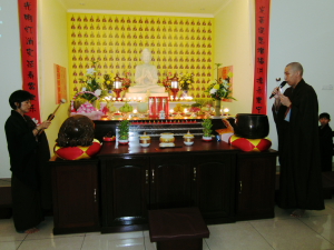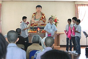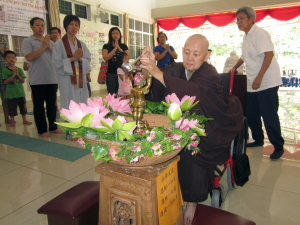 佛陀日当天早上9时30分开始的浴佛法会由维那师父带领130位左右的佛友唱诵《炉香赞》掀开序幕,三称南无本师释迦牟尼佛圣号后,大众唱诵《心经》和《赞佛偈》。接着就是浴佛法会的“高潮”时段——大众在真如法师的带领下,一边虔诚地唱诵《浴佛偈》,一边依次序列队出班浴佛,希望借此能提醒大众通过佛法来清洗干净我们的身、口、意三业。浴佛法会仪式在大众浴佛完毕后维那师父带领大众作三皈依和回向后结束。