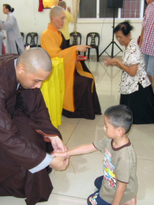 中午12时半,传授三皈五戒的仪式在真如法师的主持下开始了,共有14位佛友皈依,3位佛友受五戒。师父先向佛友开示三皈五戒的内涵及其利益,再进行传授仪式。受三皈五戒的佛友们向真如法师领取三皈五戒证书后,维那师父带领大众回向,仪式就圆满结束了。
