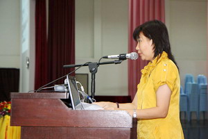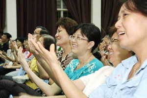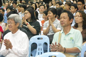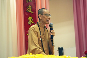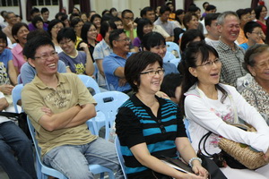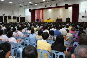 从慧明法师在台上丰富的说法表情,一举一动无不增添法音的生动处。法师说法中多国语言的运用(普通话、闽南语、粤语、英语),让人耳目一新,倍感亲切!现场上,当法师谈到精彩部分时,信众掌声连连,笑声此起彼落。