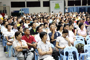 在五月二十六日晚上八点至十点,台湾慧明法师在菩中礼堂首日开坛说法,逾500人与会。在接近八点时,人潮依然不断涌入。此场连续五天的弘法大会实在难遭难遇,在人潮济济座位不足下,主办单位檀香寺慈悲让信众涌入并不断添增椅子。现场盛况,实在非笔墨可以形容,台上法师妙语如珠,台下信众听出耳油。