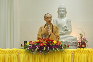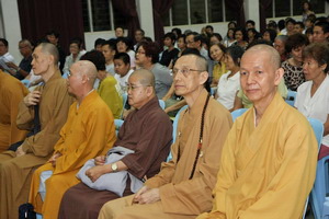 感恩唯悟法师的慈悲安排。在这新落成的菩中礼堂,我们会有五个晚上将我们的生命提升到菩萨的境界。唯悟师父提说要讲‘菩提心,菩萨行’。其实,在2007年,我们那时候也举办了以‘菩提心,菩萨行’为题的巡回弘法来为菩中迁校筹款。现在,唯悟师父再次邀请我,希望我可以发挥更好的功能。”