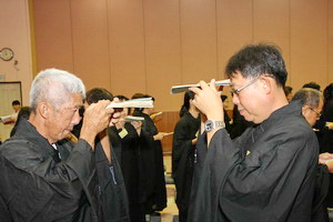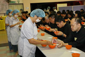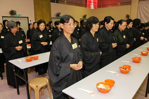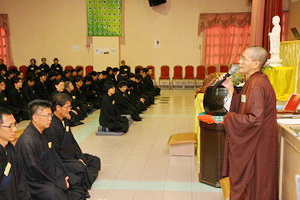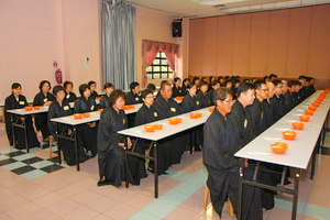 五月三十一日星期四中午十二时始,在众盼期待下,许多同修带着虔诚的心情,陆续来到檀香寺报到。三点正,真信法师在五楼多元化礼堂向大家讲解佛三规则。四时正,真醍法师为大众讲解并示范学佛行仪,如搭海青及礼佛的正确方法。下午五点半,众同修到五观堂享用药石。在药石开始前,真信法师慈悲教导大家如何插班。另外,在斋堂里,法师也告诉大家用斋的规范,让大众学习活在当下,一心不乱、间中培养慈悲与惭愧心。比方说,大家在用斋时,标准的拿碗姿势要有如“龙含珠,凤点头” 、手拿椅子时要注意动作放轻等等。