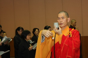 晚上七时正,檀香寺法师於多元化礼堂为佛三进行一场洒净仪式。接着,真如法师为大众讲解佛教的道德观。首先,真如法师简略介绍当今世界的两大道德观,即是神权道德与人文道德。再来,真如法师深入阐释佛教的戒律及八关斋戒。对于受持五戒的正确态度,真如法师说:“五戒,是佛陀在世时,为我们设定的一个做人的准则和要求,这个要求相当高。从中,佛陀是在告诉我们,在日常生活里,能够修到自动也自愿不杀生、不偷盗、不邪淫、不妄语和不饮酒,才有资格称为人。如果我们还会犯五戒,那我们只能算是个学徒。经典中也提及,不能够守持五戒的人,在未来世中就不能出生在人道。这个准则不但定得高,还要我们自己愿意去受持,才能作准。”另外,法师也告知佛教持戒的精神关键就在於我们处事的动机,以不偷盗为例,动机可以分为:一,因为害怕受到法律的制裁;二,因为有宗教信仰,做事遵照所信宗教的道德准则;三,在他的心里头,已经没有偷的欲念了,这个层次就更高尚了。最后,真如法师为大众解释八关斋戒。