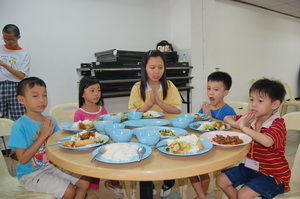 早餐过后是团康环节。在三位爱心老师的带领下,孩子们都非常投入地唱唱跳跳。小朋友的吸收能力相当强,在短时间内就把歌曲记下了。团康歌曲有《地球的孩子》、《爱心小菩萨》、《发好愿说好话》和《幸福的脸》。