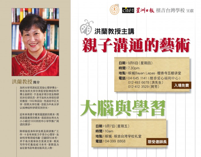 由槟吉台湾学校,星洲日报,城邦出版社与檀香爱心福利中心联合呈献 洪兰教授讲座