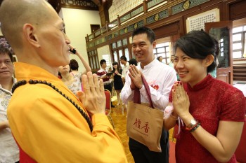 该寺监院真如法师与婚姻注册官助理陈炳根,為这些新人主持佛化祝福与注册仪式,当中有两对新人的特殊情缘引人注目,一对是华印混血儿嫁给青梅竹马的华裔同学,另一对是在加拿大留学擦出爱的火花的马中异国情缘。