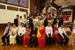 当天的仪式在上午9时40分开始,13对新人在“美满姻缘” 佛曲播放时,徐徐步入大雄殿,并在佛前献香、花、灯、果,所谓:香气蒙薰遍十方,灯破黑暗耀长空,花开艳丽吐馨香,果证十地觉行满。