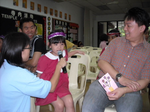 娱兴节目有幼二班的许洁怡小妹妹唱诵“般若波罗蜜多心经”, 不要小看年纪小小的她,清脆悦耳的歌声可以媲美著名的歌手。接着还有六岁班的小朋友清唱《点灯的孩子》,看到小朋友们精湛的演出,爸爸妈妈们十分开心,不断地给予热烈的掌声以鼓励他们。