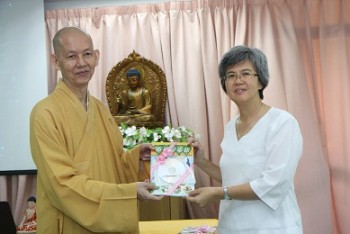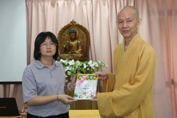 活动当天,由檀香寺住持-释唯悟法师向各位教师们慈悲开示。 师父表示,主要内容是传达孝顺父母及尊师重道之概念予学生。因此,教师们必须身体力行实行之,如此方可引导学生们落实此两项善法。师父亦表示,教师们必须有使命感,并且尽力把融合在生活上。这是由于即是学习做人的基础。师父提醒我们,首先应该把做人的根基打稳,进而深入学习佛法。师父也强调身教非常重要,因此为人师者及家长们应该以身作则,为孩子们树立一个学习的好榜样。除此之外,师父在课本推展礼上表示感谢一切成就完成此课本的因缘。