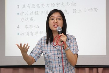黄来兴老师则以实验让学员们深切了解“用功读书”的重要性。在上课前,黄老师把事前准备的三个杯子分别排列在桌上,并且让三位学员出来利用桌面上的杯子盛水喝。这三个杯子分别是,第一杯口朝下放、第二杯子底下有孔、第三则是肮脏的杯子。第一位学员出来示范利用杯口朝下的杯子盛水,但是无论学员如何尝试都无法盛一口水;第二位学员的杯子有孔,因此无法盛满水;第三位学员的杯子虽成功盛满一杯水,却因为杯中含有肮脏物品却无法入口。这时黄老师就向各位学员们解释,其实我们学习的态度就像这三个杯子一样。如果我们觉得自满,不肯接受他人的教诲,那再好的知识学问我们都无法吸收;如果我们学习的态度得过且过,就会像第二个杯子一样左耳进右耳出;第三,如果我们抱着不认真的学习态度,那么就会像第三个杯子一样,虽然可以盛满水,却无法运用。