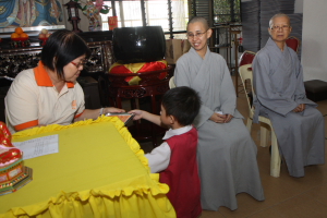 法师讲解后就进行受持仪式。家长与老师一颗恭敬心在佛前宣誓 “从今天起,将在日常生活中实践《福智十善法》”。