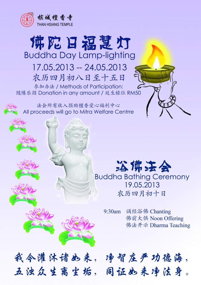 | 19-5-2013(日) | 9:30 a.m. ~ 12.00 p.m. | 浴佛法会、佛法开示、佛前大供、福慧灯回向、大愿殿回向 |