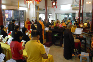 吉隆玻昙华苑于4月7日圆满举办了2013年度清明超度法会。今年约有五百多位信众报名参加清明超度法会,当天到来修持三时系念的也有两百多位。大家用过法会所提供的素午餐之后,便在主法和尚真如法师、维那真禅法师、及真舍、真道、真愿、慧修等众法师带领之下,以虔诚恭敬的心,修持三时系念。此次法会与往年不同之处是,所有的法器都是师父们亲自操作。师父们天衣无缝的配合,使得整个法会过程庄严殊胜,令参与的信众们欢喜赞叹。首次莅临昙华苑带领三时系念的真禅法师,其洪亮清析的声音尤其让信众们留下深刻的印象。真如法师在开示时段向信众们讲解清明节的起源,让大家对这个孝亲节日有深一层的了解。法会在下午6点圆满结束。感恩真舍法师不辞辛劳筹备法会,也感谢一群义工菩萨与法师紧密配合;大家同心协力、各尽其职,令法会得以圆满举办。