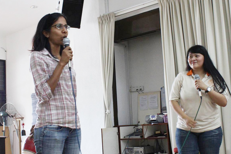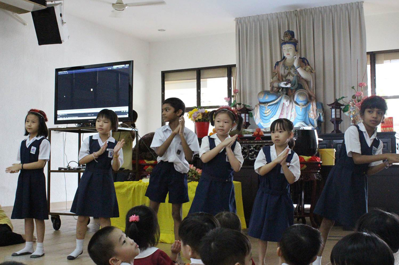 接着就是娱兴节目,首先由5岁小朋友呈现的手语《红红的太阳》和《地球的孩子》,安亲班则表演《礼貌歌》。幼儿园的小朋友以《佛光照耀你》、《佛化生日歌》祝福生日的小朋友。幼儿园也特地安排生日的小朋友亲自为父母亲送上一张简单且意义非凡的生日卡,并要他们拥抱父母、感恩他们。同时,爱心老师再递上小手帕,孩子们帮妈妈抹抹手和脸,虽然孩子们的动作有点生疏、滑稽,有些家长也显得有点尴尬,但是我相信在他们的心里有一股暖流,因为从他们的脸上看到充满幸福温馨的笑容。大会还安排访谈环节,家长们都给予正面鼓励的话语,他们都一致认为很开心把孩子送来檀香上课。