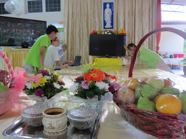 当天大约有八十位信众来参与孝亲法会, 让一整天的念佛共修、三时系念佛事顺利完成。上午九时正至十时五十分的念佛共修环节,法师与工委、信众们一起修持,保持正念的念佛,念法,念僧,净化人心,庄严整个道场。上午十一时正,是佛前大供、延生坛回向、净土坛回向。念佛功德回向给布施者和往生者,表达出对受者的一份尊敬心。中午十二时是休息和用午斋时间,让大家有精神和体力应付接下来的共修环节。