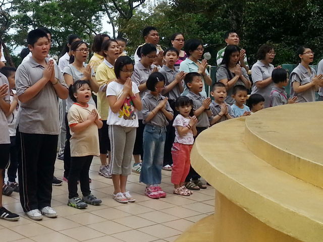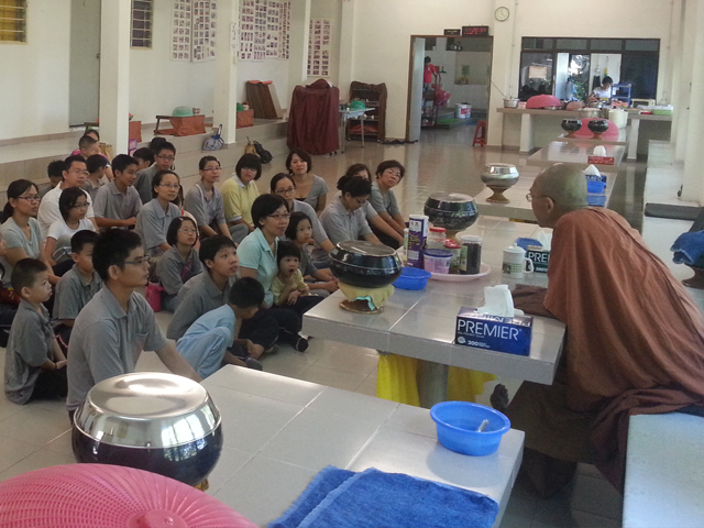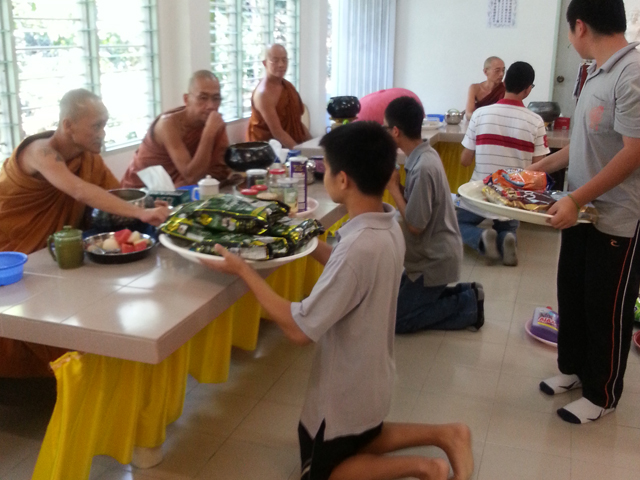 在11时47分,大众开始以素菜及干料等供养5位师父。众师父也为大家念《慈爱经》,并带领众人做回向。之后,众人齐聚一堂共进午膳,直至12时59分后方依循原路下山。大众抵达山脚时已是下午1时40分了。