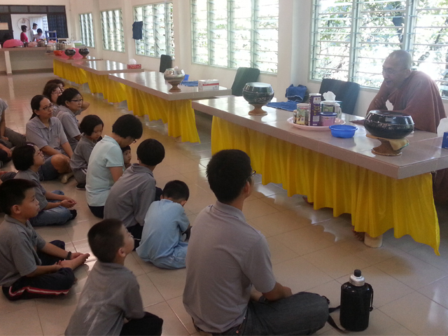 8时53分,众人在准备妥当之后就开始登山。抵达山腰分叉路时已是9时05分,大伙在告示牌的指示下向右方继续努力前进。虽山路陡峭,可一路有威省壮美的风景在右侧相伴,已足以慰藉大家的辛劳。9时58分,众人已陆陆续续抵达山顶。除了在珮婷师姐的带领下,绕塔三匝,大家亦趁此难得机缘四处游览秀美景色,拍照留念。直至10时46分,大众方才摄心,聚集于正殿,等待Bhante Saddhasiri的佛法开示。首先,Bhante先带领大众礼敬三宝,念三皈依、五戒,当然也不忘祝福大众吉祥安康。此次的开示以佛教的五戒为主要内容。Banthe Saddhasiri说,佛法不应只是局限于佛教徒修持而已,而应在于全人类。现今社会暴力事件层出不穷,乃不守戒律的缘故;不守戒律,将造成一个人没有道德。