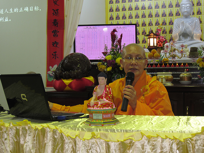 洒净仪式完结,大众即聆听上真下信法师的慈悲开示。首先,法师提到大家在农历新年期间常互相祝贺恭喜发财,新年快乐。其实,我们可以从佛教的角度来诠释“恭喜发财”。“喜”是指“法喜”,是由清净心所生起的,指的是我们听闻佛法之后,所生起的欢喜或喜悦。当我们学佛修行到某个阶段之后,所得到的第一个好处就是有“法喜”,就是真正尝到法的味道,而心生喜悦。若有了法喜,我们学佛就会学得更精进。我们念佛若有了法喜,就会越念越起劲、越精进。我们学佛若能学得如法的话,妄念自然会减少,烦恼也逐步的减少,心情会感到愉快,心中生起喜悦,即“法喜充满”。