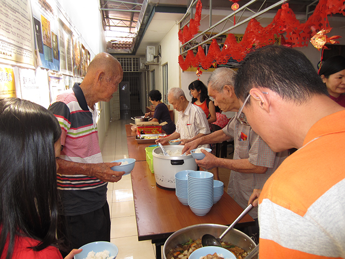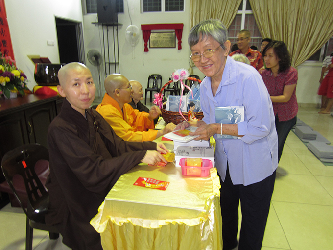 农历正月初一早上11时,45位佛友齐聚檀香净苑佛殿进行佛前大供和新春吉祥灯回向。在新春吉祥灯回向里,大众三称南无增福寿菩萨摩诃萨和南无消灾延寿药师佛,再念药师灌顶真言七次并回向。新春吉祥灯回向将继续进行至正月初九,并在早课后进行。之后,师父、檀香晚晴苑的老菩萨以及佛友们一起享用美味可口的素肉骨茶午餐。