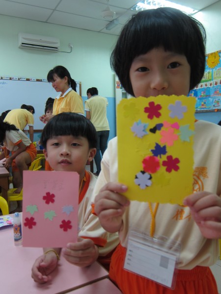 小菩萨们体会了父母的伟大后,爱心老师就带领他们自制感恩卡片送给亲爱的家长们。他们以最真诚的心制成美丽的彩色图形卡,并亲手写上贴心爱语当恩物,以表达心意。
