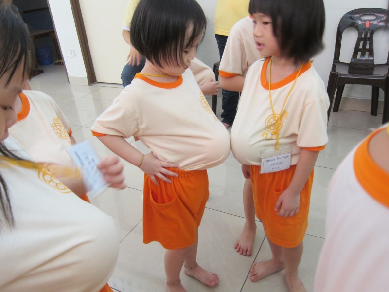 为了让小菩萨们体会母亲的伟大,老师准备装着四分之三水份的气球让小朋友放在腹部。这气球犹如妈妈腹中的胎儿,而小菩萨们须细心地关心,并用爱心地照顾及保护它。他们也可从中体会到妈妈的辛劳。希望他们学会珍惜及孝顺父母。