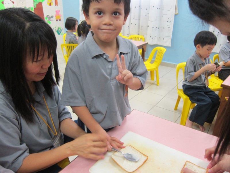 之后,小菩萨享用他们在生活营的第一餐 - 早点。 他们都依照老师的指示,很有次序地安静到斋堂等待享用爱心早餐。由邱老师带领供养偈及结斋偈。小菩萨们填饱肚子后便精神充沛地参与各项促进肌体发展、培育团体合作精神的游戏—独臂神功;口香糖。