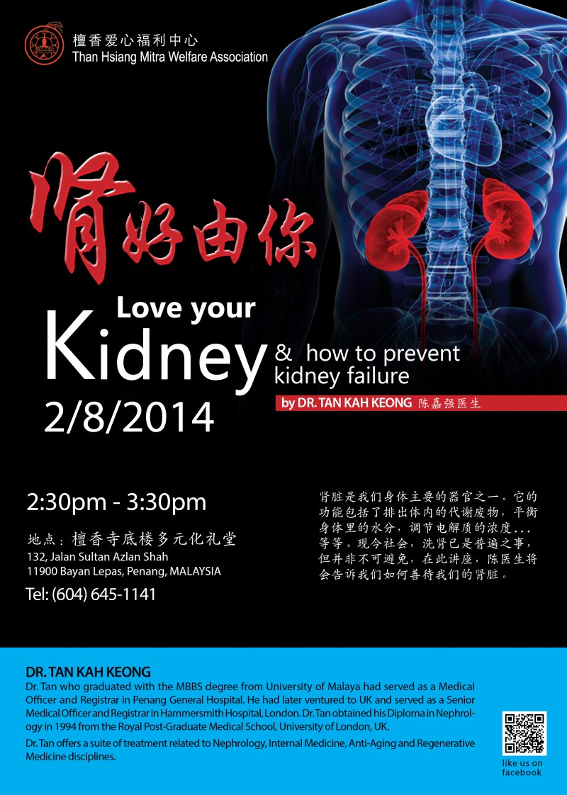 Submitted by willyk on Fri, 11/04/2014 - 09:31 肾好由你肾好由你 Love your kidney and How to prevent kidney failureBody: 肾脏是我们身体主要的器官之一。 它的功能包括了排出体内的代谢废物,平衡身体里的水分,调节电解质的浓度……等等。现今社会,洗肾已是普遍之事,但并非不可避免,在此讲座,陈医生将会告诉我们如何善待我们的肾脏。 宣传 Log in to post comments6564 reads