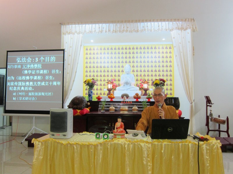 当晚的佛学分享会分为两个环节。第一个环节的主题为《推广佛教教育的重要性》。主讲人是昙华苑住持上真下如法师,法师在一个小时的时间内介绍了国际佛教大学、义净佛学院和远程佛学课程(硕士学位)及招生。