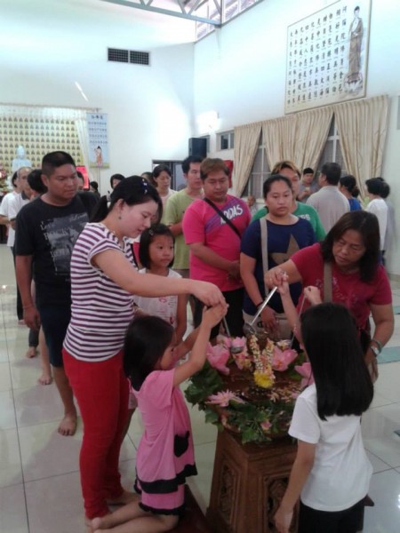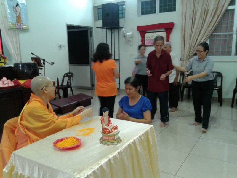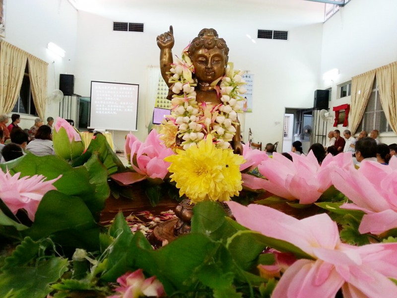 佛陀日当天阳光普照,早上9时30分开始的浴佛法会由维那带领佛友唱诵《炉香赞》掀开序幕。接着,大众坐下聆听真信法师的慈悲开示。真信法师告诉大众佛陀日是纪念佛陀诞生、成道、涅槃的大日子。太子诞生时有三种瑞像:(一) 脚踏七步,步步莲花现,显示了菩萨的清净无染。(二)一手指天、一手指地,并宣称:“天上天下,唯我独尊。” 显示太子在这一生将会成就佛陀的无上果位。(三)天人奏乐,天上散下许多香花,九龙吐水为太子沐浴。天龙的欢喜告诉了我们佛陀的尊贵;释迦牟尼佛在菩提树下成道时说:“奇哉!奇哉!大地众生,皆有如来智慧德相,但以妄想执着,不能证得。”这无疑显示了众生之佛性与佛陀是平等的。每一个众生,只要依教奉行,最终都能成佛;涅槃,华译为“圆寂” 或“解脱”,即灭烦恼度生死,圆满种种功德智慧。