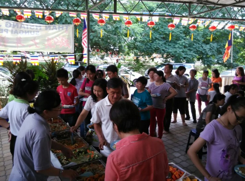 接着,维那带领大众进行佛前大供和福慧灯回向,然后大众依序列队向真信法师领取黄色线,之后才秩序井然地在大殿前排队领取食物享用午餐。佛友们离开前也踊跃领取祝福礼——花水。