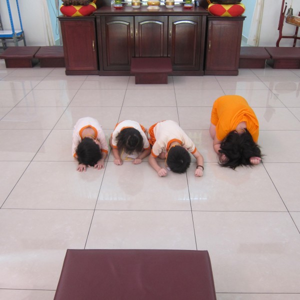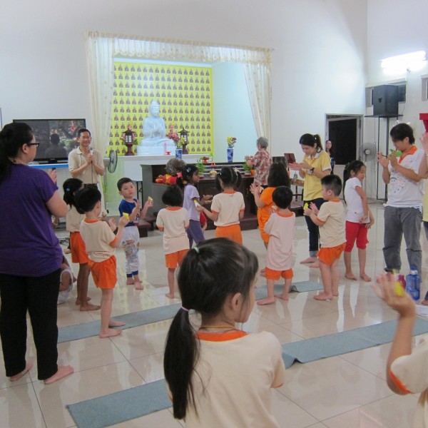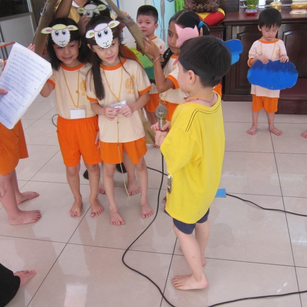 吴老师指导爱心老师们学佛行仪一问讯,再由各小组老师带领各组小菩萨学习礼佛。上午10点整,小菩萨们开始享用生活营的第一顿营养早点。小菩萨们都有依照老师的指示,虔诚的齐偈及结斋偈。 小菩萨们在享用早点后积极地演练三只小绵羊戏剧以备表演。紧接下 来,是游戏环节。游戏名称是丢手绢,小菩萨们显得格外精神,尤其 是在你追我躲的情况下更为紧张,在旁的爱心老师们都为该组的小菩 萨加油打气。游戏结束后,尚可听见部分的小菩萨正哼着游戏时的歌 曲。