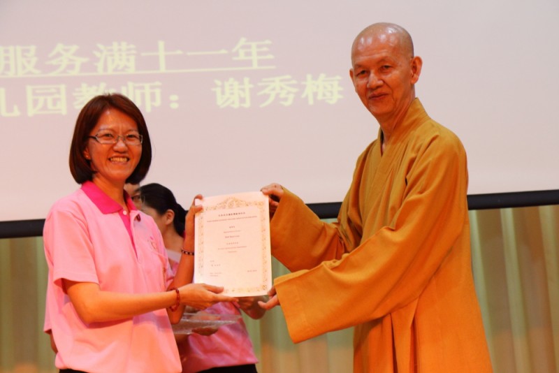 接着便是 “颁发职员服务奖”的环节。唯悟师父亲自颁发奖项予檀香各部门资深的服务人员,感恩职员们多年来不辞劳苦地为檀香服务。每一位上台领取奖项的员工,脸上皆法喜充满,心存感恩。