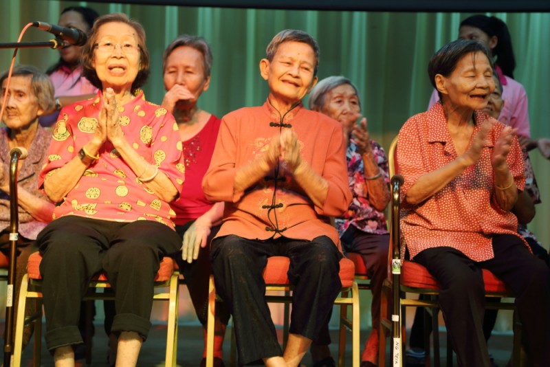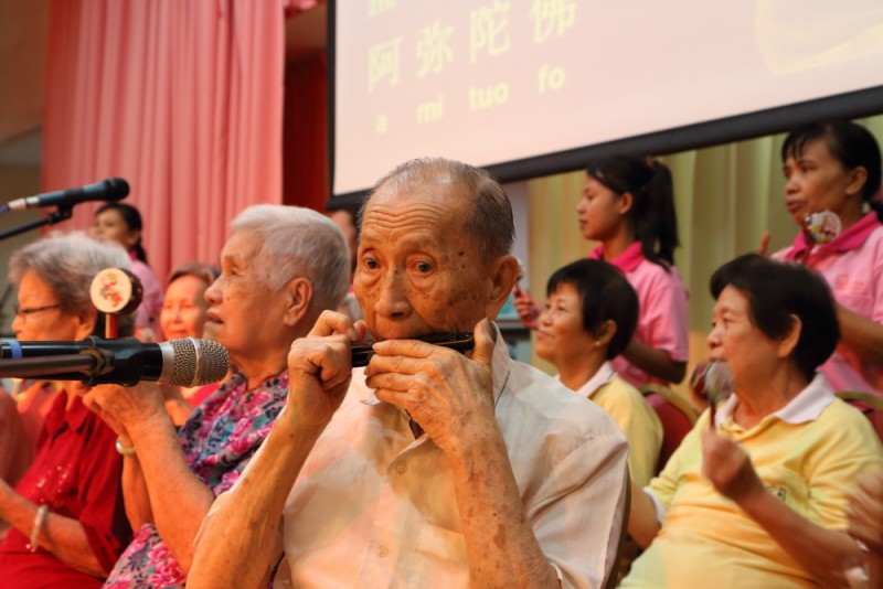 “咔擦!”一个按钮,一声快门,全体职员的欢喜永久保鲜。接着下来的压轴余兴节目是新港晚晴苑老菩萨们诚意为大家献上的合唱(口琴伴奏)表演。老菩萨们带来的歌曲有“晚晴苑之歌”、“弥陀花鼓”、“阿弥陀佛力量大”及“You are my sunshine”。