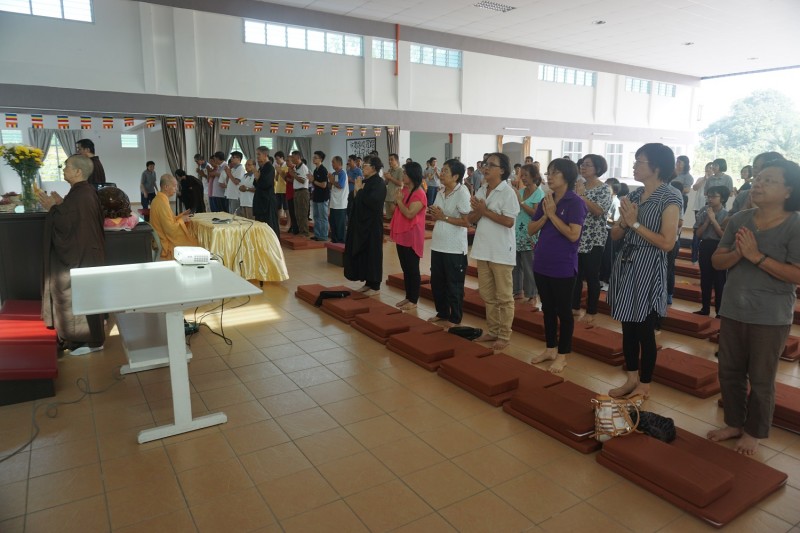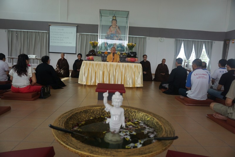 9点45分,禅苑的家族成员便上楼跟其他佛教团体的佛友一起参与浴佛法会。法会正式开始前,大众恭请主法和尚上唯下悟法师为大众慈悲做浴佛前行开示。法师先是厘清为佛陀沐浴的错误观念,说其实真正需要洗涤身心的是我们这些凡夫。然后法师讲解浴佛流程,接着便依着流程一一解释经文意义。法师解释为什么浴佛法会要唱“大悲咒”及“心经”。法师说前者代表慈悲,后者代表智慧。慈悲及智慧为佛教两个重要教义。唱诵“大悲咒”及“心经”即是希望大家能学习观世音菩萨出世间的慈悲精神及圆满的智慧。