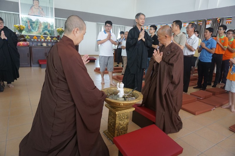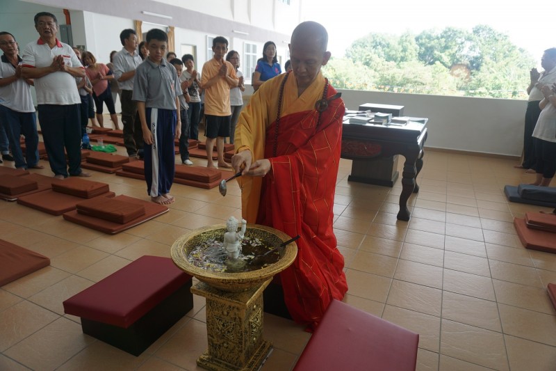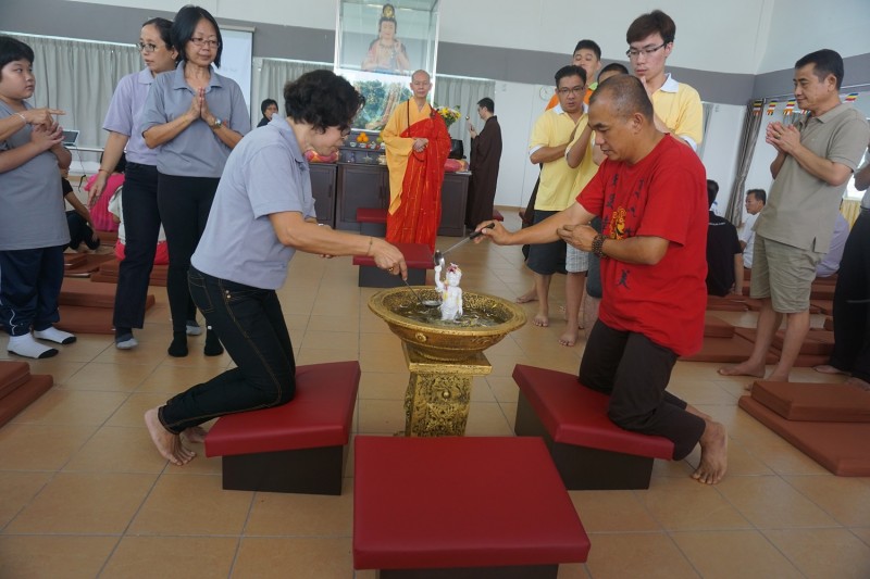 10点30分,大众至诚礼谢主法和尚后,浴佛法会便在主法和尚带领下正式开始。唱完“炉香赞”、“大悲咒”及“心经”后,便是唱诵“浴佛偈”时刻。主法和尚及常住法师们领先浴佛过后,大众便分东西两班随着次序逐一“外沐佛身,内净自心”,并借着香汤花水灌沐来提醒自己时刻保持身心清净学习观世音菩萨的慈悲与智慧。