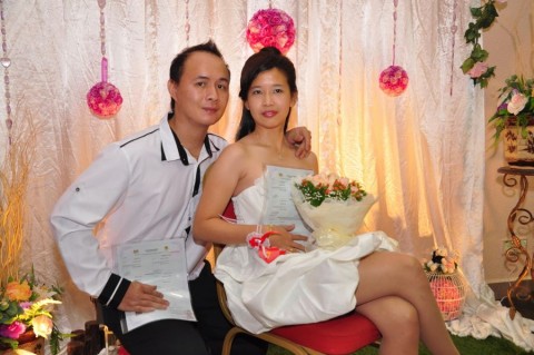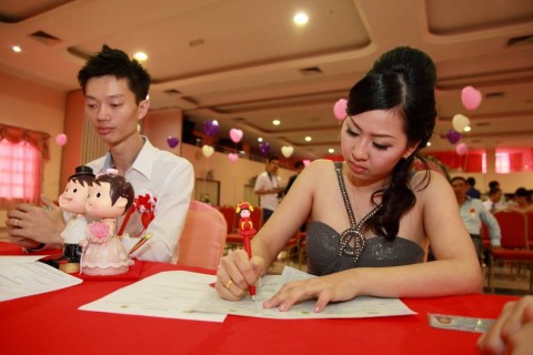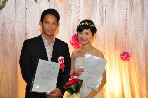 婚姻注册官助理陈炳根先生在五楼礼堂为13对新人主持婚姻注册。