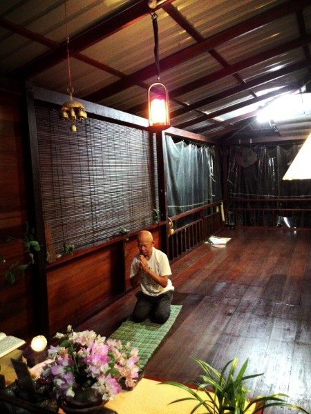 据爸爸说,在妙香林学佛不知不觉也有十多年的光景。除了改了一些生活习惯和习气,他对佛法还存有很多的疑问和不解,他那时学佛都是在祈求平安和世间安乐,注重培福,对佛法的理解和行持都没有很认真地去学习。他是经过后来不断的闻思修,才对教理比较明白。他用佛法去观察生活里的一切人、事、物。随着时间的推移,及人生经历的累积,他对佛法有更深的体会,时常感触的说:“全世界,只有佛陀是讲真话的人,讲真相的人。”这句话成了他常掛嘴边的话语。在日常生活中,遇到任何大小事情,无论是顺境或是逆境,他都会哈哈大笑说:“这个就是因缘法!这个就是因缘法!”此时,他对三宝打从心底里深信不疑,三宝才是世界上最宝贵的,学佛的因缘,他今生不能再错过了。追求初果,往生净土,成了他在有生之年要实践的一项重大的任务。他为了能全力以赴地追求他的理想,便跟随我的出家姐妹们在山上修行。他日日如是地诵经、念佛、静坐、听经、看佛書。他虽然年迈,仍然發心护持道场,所以山上很多粗重、辛苦的工作,他也一贯如往地扛起来,并且认真又有耐性地一一完成。
