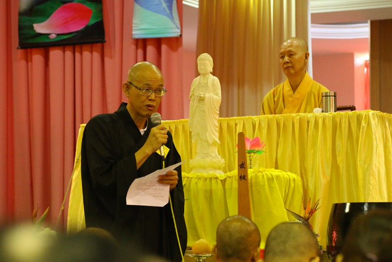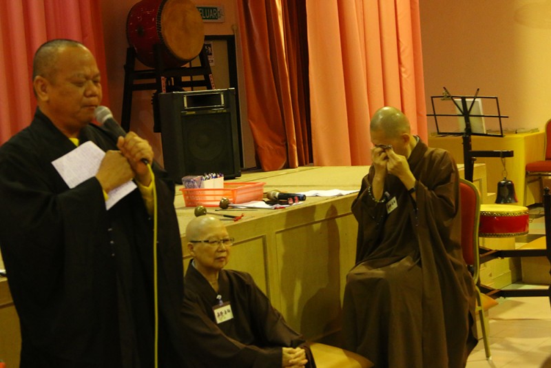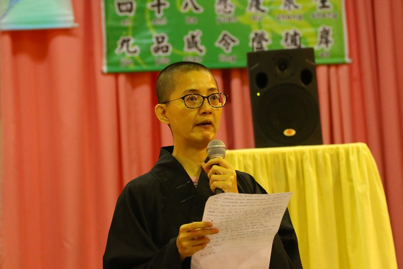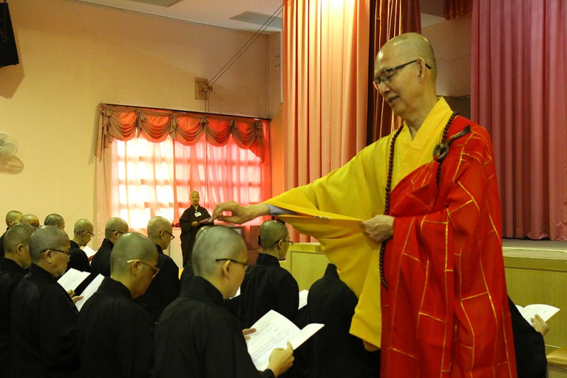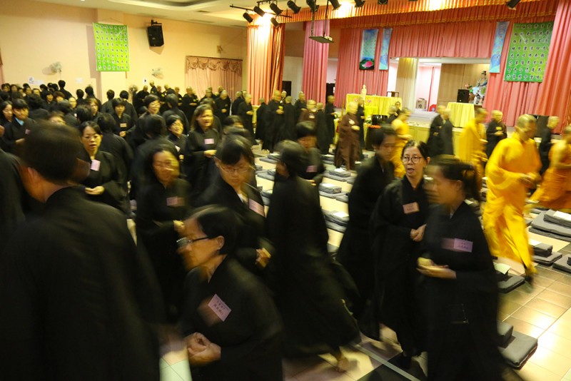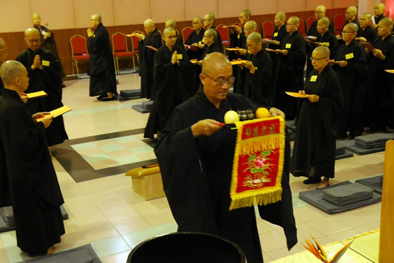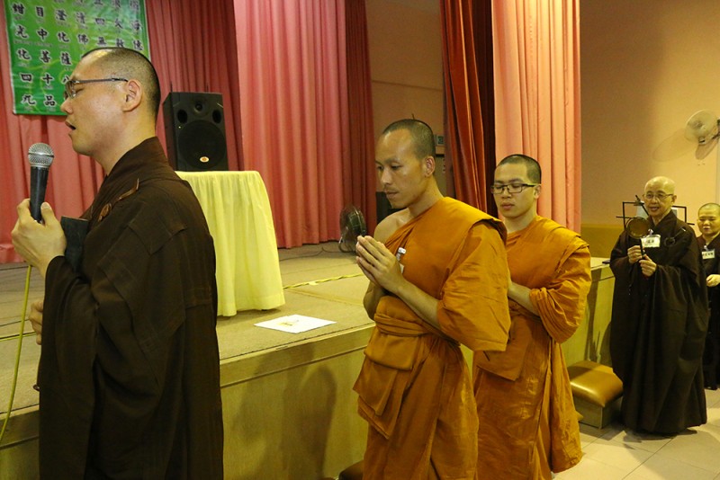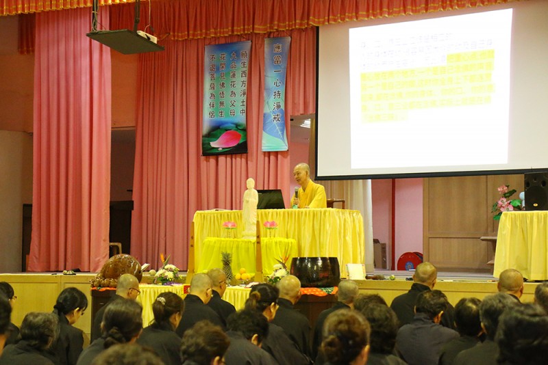 檀香寺住持唯悟法师于首晚7时在五楼礼堂主持洒净仪式及开示,师父说在150多位报名者当中能有144名报到,是很高的出席率;希望戒子们把握这难得的机缘,在精进佛七(短期出家)期间好好用功,对念佛法门能有正确的概念。他希望当中不少参加过的戒子能有更深一层的认识及体会。
