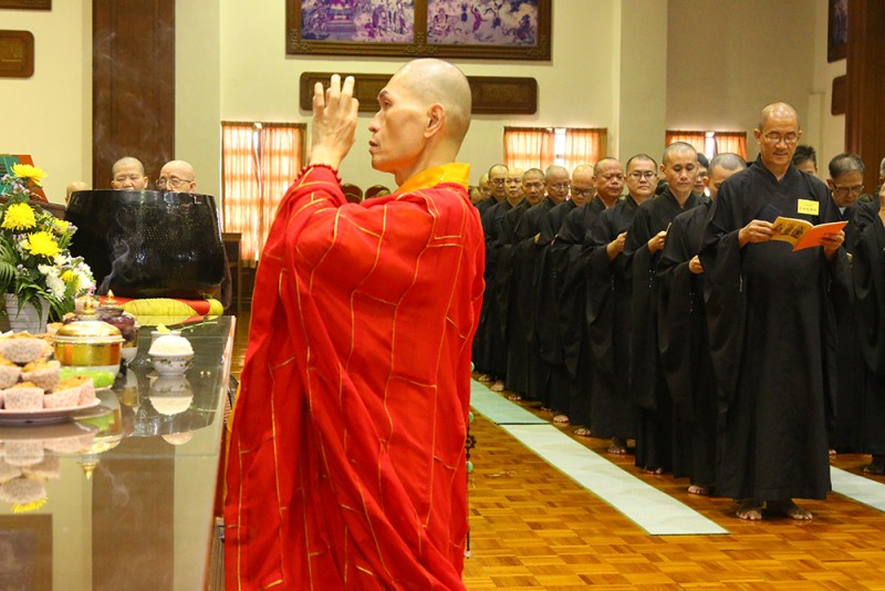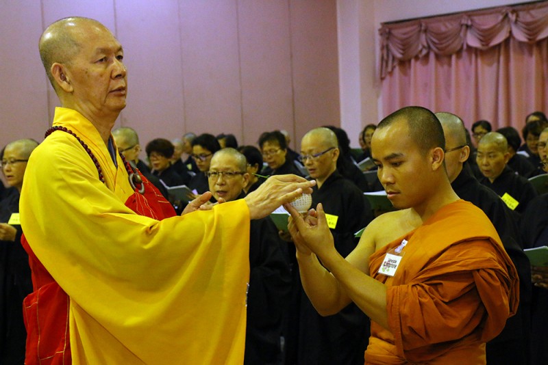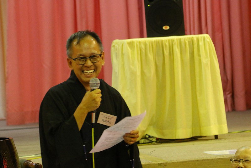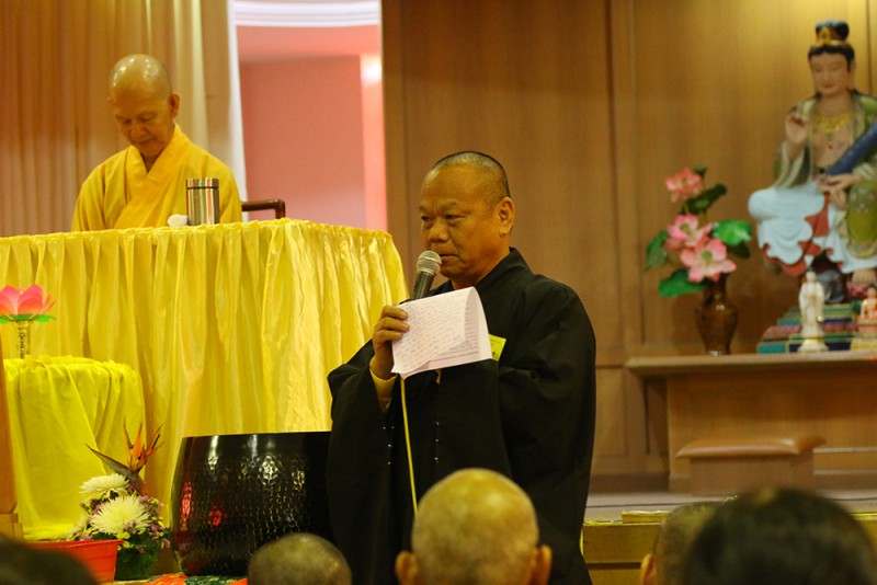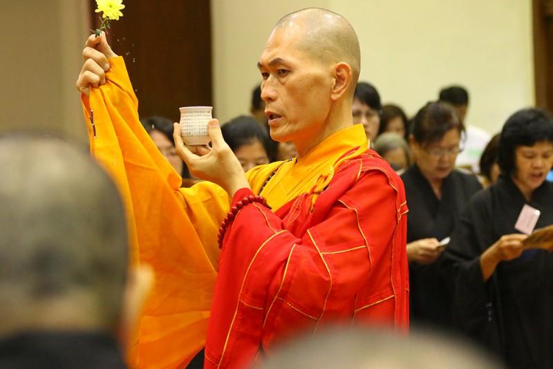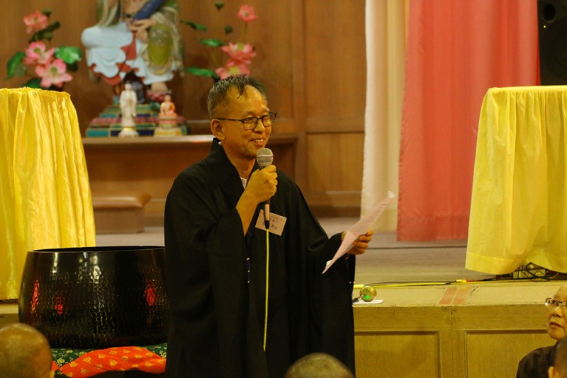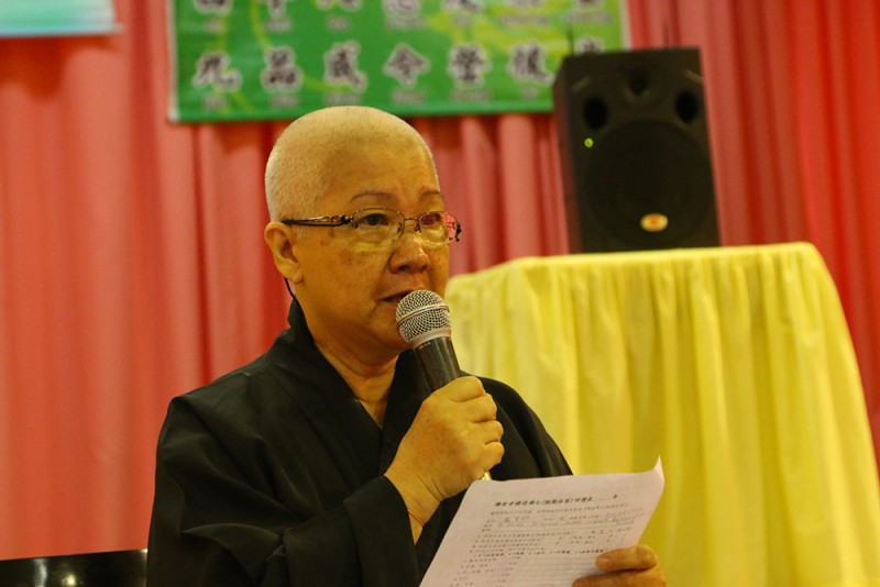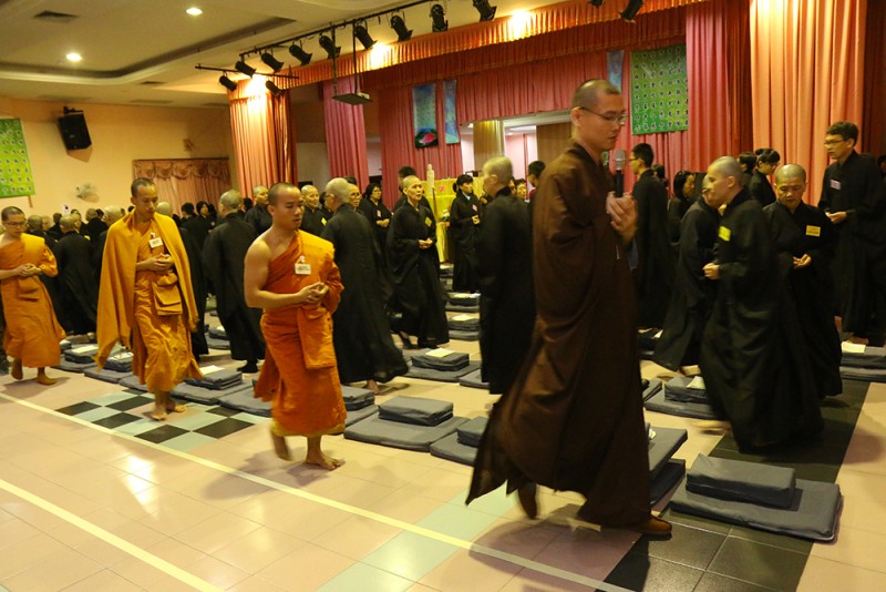 檀香寺住持唯悟法师于首晚7时在五楼礼堂主持洒净仪式及开示,师父说在150多位报名者当中能有144名报到,是很高的出席率;希望戒子们把握这难得的机缘,在精进佛七(短期出家)期间好好用功,对念佛法门能有正确的概念。他希望当中不少参加过的戒子能有更深一层的认识及体会。