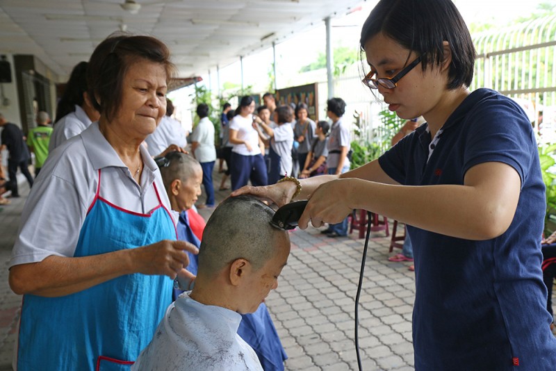 在11月25日 中午12时至3时,来自全国各地包括东马的戒子陆续抵步峇六拜檀香寺大悲殿报到,在报到处领取罗汉挂后,其中参加短期出家的戒子立马移步至大悲殿旁的三圣殿前落发,约有20名义工等候为戒子们削发,剃一个头可能需要同时出动3人同时动手,高效率的为戒子们削除三千烦恼丝。当中一些戒子在落发时口中持颂佛号,在落得一地烦恼丝后,这些戒子可以感受到突然一头轻松,开始感受出家体验。这些戒子在报到及落发后移步至各自指定的寮房挂单。