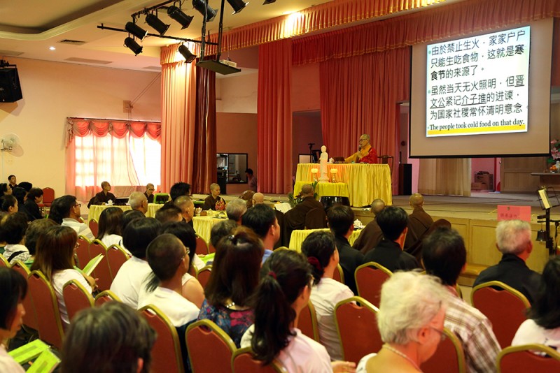 真如法师在法会第一时结束后开示,分别讲解清明由来以及《三时系念佛事》,法师先说清明的由来,原来是春秋战国晋文公放火烧山要逼使一名忠臣介子推出山帮理国家,却不幸烧死介子推母子,晋文公在懊恼不已下规定介子推祭日当天只吃生冷食物,这也是寒食节由来,在隔年又将当天定为清明日。